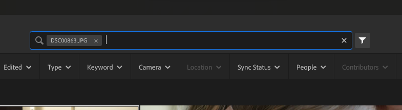 Open up Lightroom CC either through the app or through a browser. In the search box, enter the filename, including the file extension, e.g. DSC00863.JPG like in my example. This should show you the photo causing the issue. If it’s not showing, make sure you’re using the right version of ‘0’ (zero) vs the letter ‘O’ in the spelling of your filename.